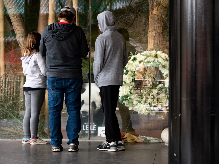 People mourn in front of an image of giant panda Le Le at the Memphis Zoo in Memphis, the United States, Feb. 4, 2023. (Photo by Adam/Xinhua)