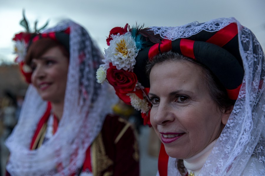 Women in traditional costumes are seen in Elefsina, Greece, Feb. 4, 2023. (Xinhua/Marios Lolos)