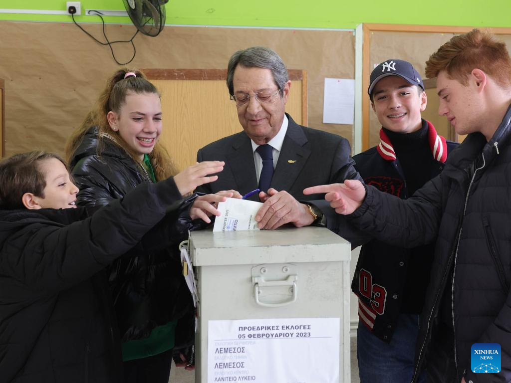 Cyprus' outgoing President Nicos Anastasiades (C) votes at a polling station in Limassol, Cyprus, Feb. 5, 2023. Former Cypriot Foreign Minister Nicos Christodoulides took the lead in Cyprus' presidential election on Sunday, and will face off with Andreas Mavroyiannis, who came second, in a runoff on Feb. 12. (PIO/Handout via Xinhua)