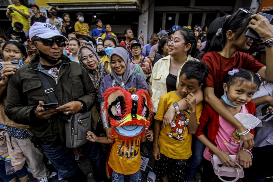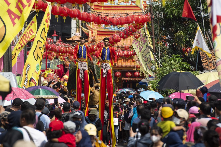 Artists perform in a parade of Lantern Festival 2023 celebrations at Hok Lay Kiong in Bekasi of West Java province, Indonesia on February 5, 2023. (Xinhua/Veri Sanovri) ■