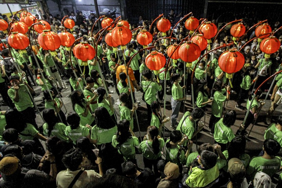 People hold lanterns during Lantern Festival celebrations in Bogor, West Java, Indonesia on Feb. 5, 2023. (Photo by Sandika Fadilah./Xinhua)