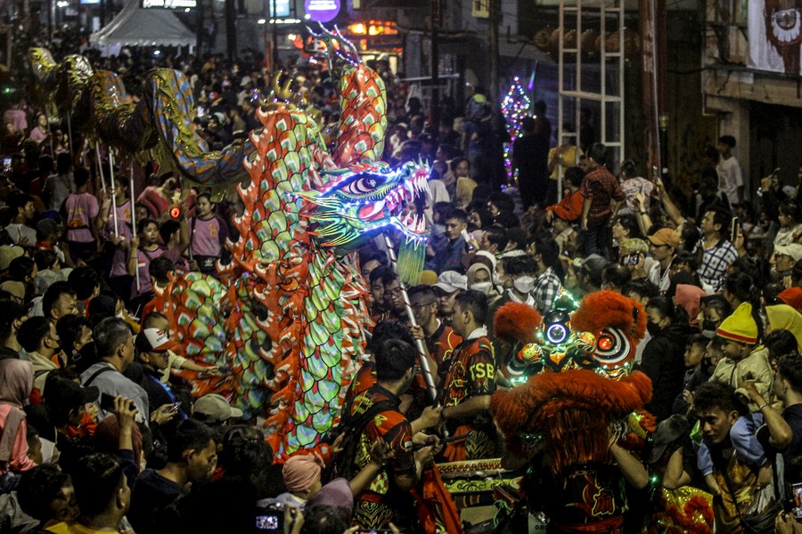 People perform dragon dance during Lantern Festival celebrations in Bogor, West Java, Indonesia on Feb. 5, 2023. (Photo by Sandika Fadilah./Xinhua)