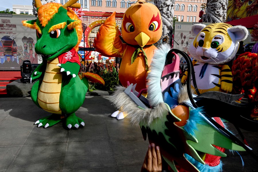 People wear costumes of Chinese legendary animals to welcome visitors during the Lantern Festival celebration at Old Shanghai Sedayu City in Kelapa Gading, Jakarta, Indonesia on Feb. 5, 2023. (Agung Kuncahya B./Xinhua)