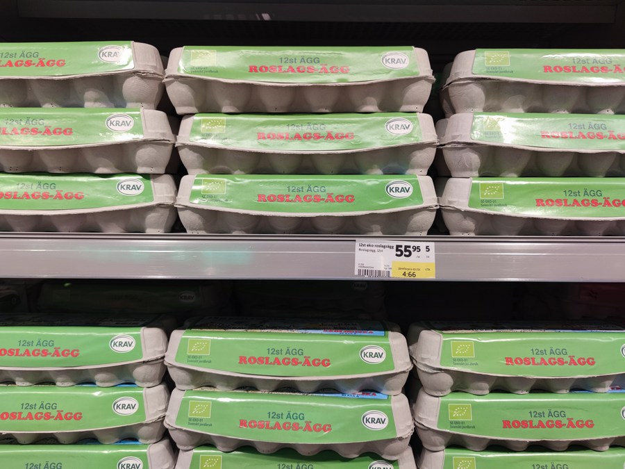 Photo taken on April 14, 2022 shows eggs on the shelf at a supermarket in Stockholm, Sweden. (Photo by Wei Xuechao/Xinhua)