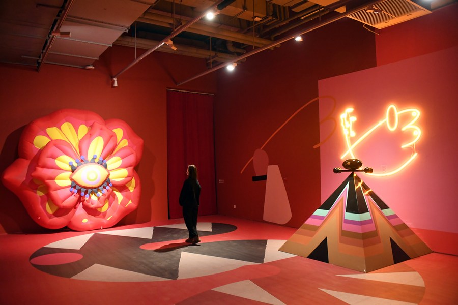 A visitor views an art installation at Blooming Echoes, an exhibition featuring the combination of sound and modern art, at the Times Art Museum in Beijing, capital of China, Dec. 21, 2022. (Xinhua/Ren Chao)