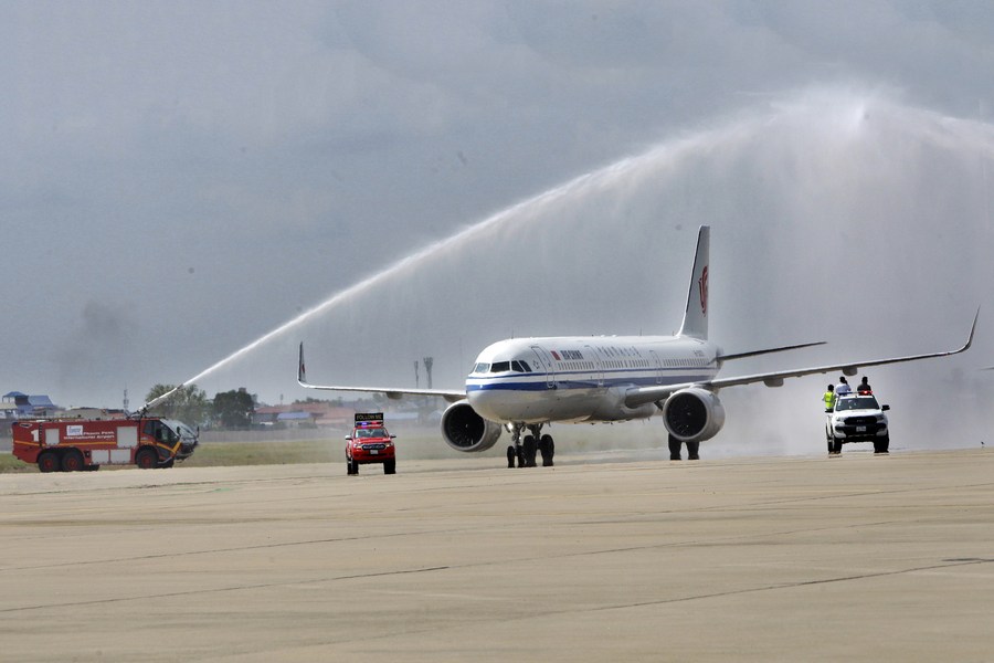 PHNOM PENH, Feb. 8 (Xinhua) -- Cambodia on Tuesday welcomed Chinese flag carrier Air China's inaugural flight to its capital here with a water cannon salute.