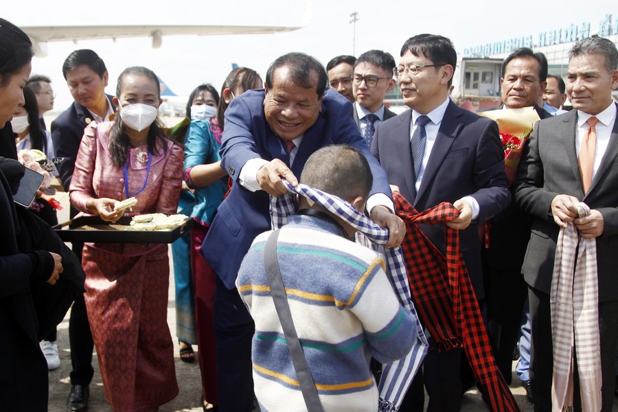 Cambodia's Tourism Minister Thong Khon (C) presents a Chinese boy with a Cambodian traditional scarf at the Phnom Penh International Airport in Phnom Penh, Cambodia, Feb. 7, 2023. (Photo by Phearum/Xinhua)