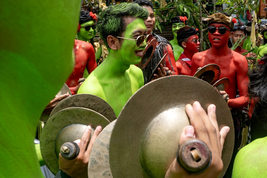Teenagers with colorful paints play traditional musical instruments during participation in Ngerebeg Tradition at Tegallalang village in Gianyar district, Bali, Indonesia, Feb. 8, 2023. (Photo by Dicky Bisinglasi/Xinhua)