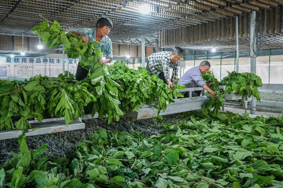 Farmers feed silkworms with mulberry leaves at a cooperative in Liantang Village of Lianyun Township, Yuexi County, east China's Anhui Province, Sept. 4, 2022. (Xinhua/Du Yu)