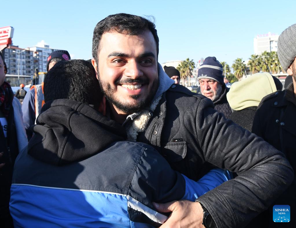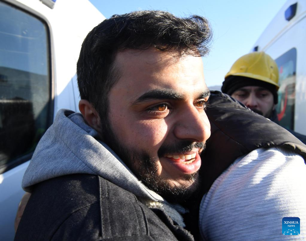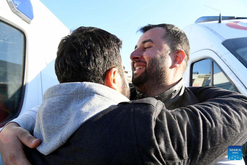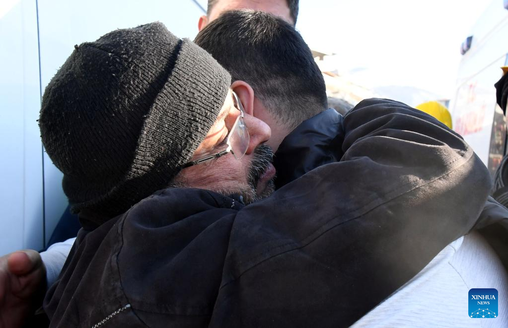 Relatives of a woman survivor hug each other in Antakya in the southern province of Hatay, Türkiye, Feb. 9, 2023. In Antakya, Hatay, Chinese and Turkish rescuers successfully saved three women from the rubble of collapsed buildings on Thursday through their joint operations. (Xinhua/Shadati)