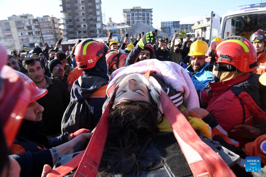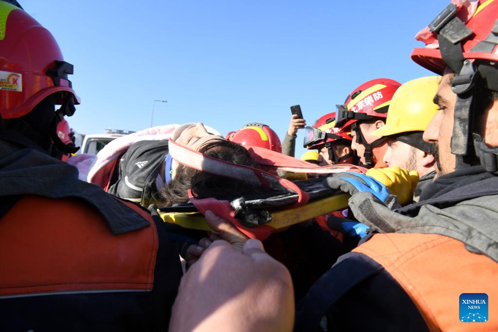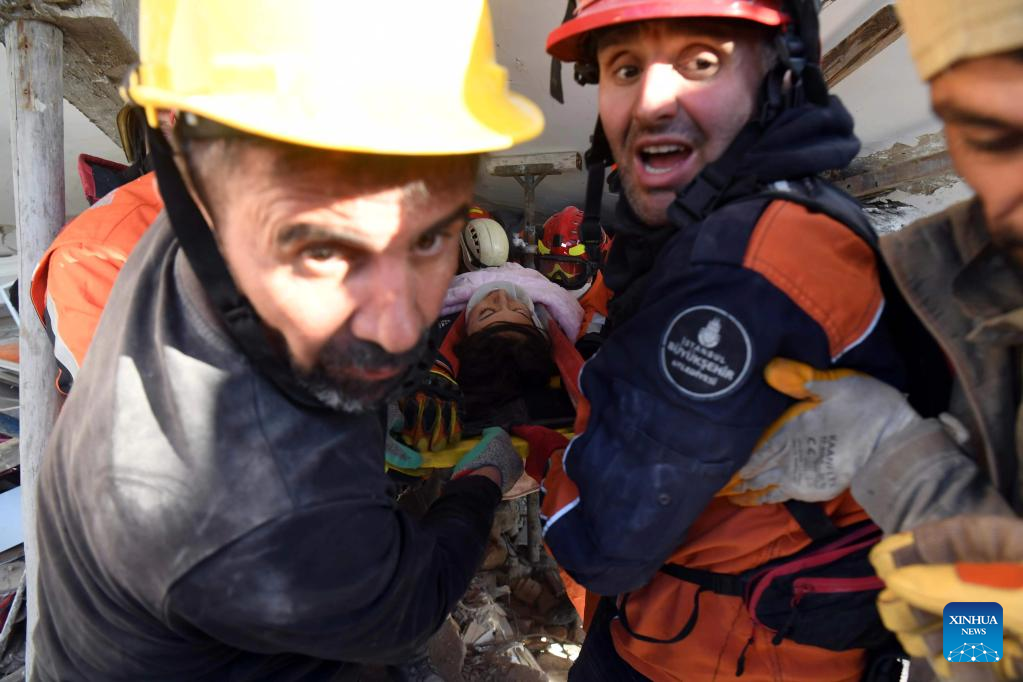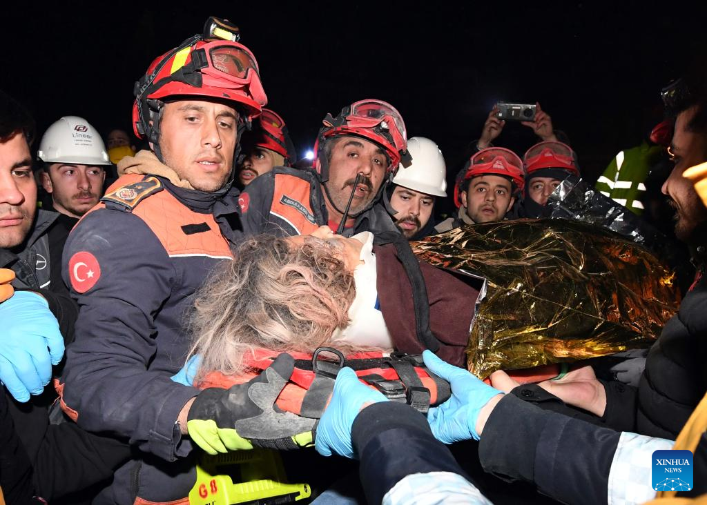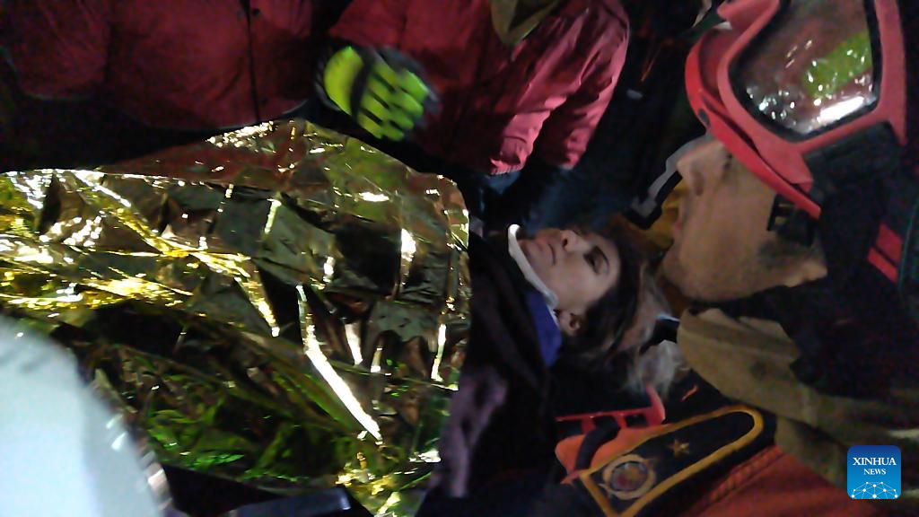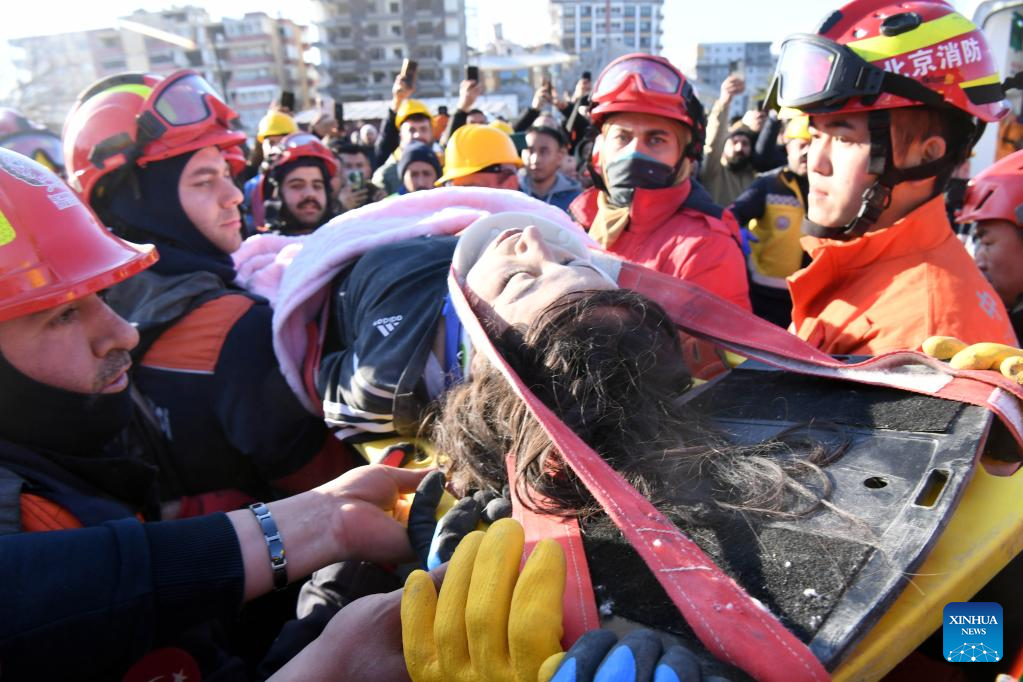Members of the China Search and Rescue Team transfer a woman survivor with their local partners in Antakya in the southern province of Hatay, Türkiye, Feb. 9, 2023. In Antakya, Hatay, Chinese and Turkish rescuers successfully saved three women from the rubble of collapsed buildings on Thursday through their joint operations.(Xinhua/Shadati)