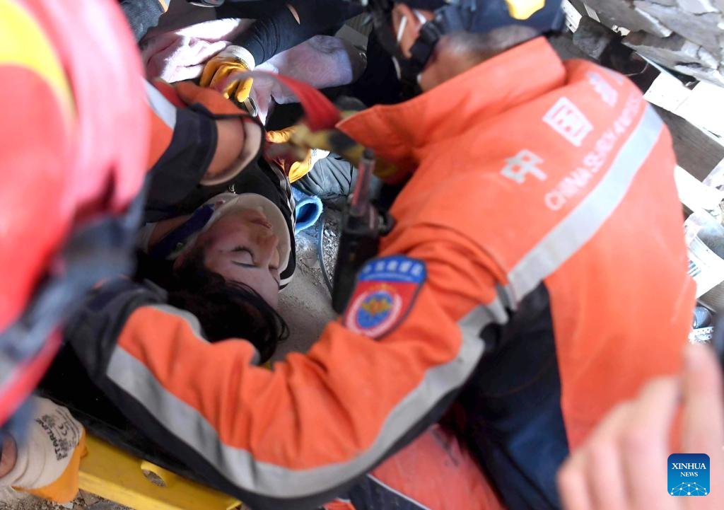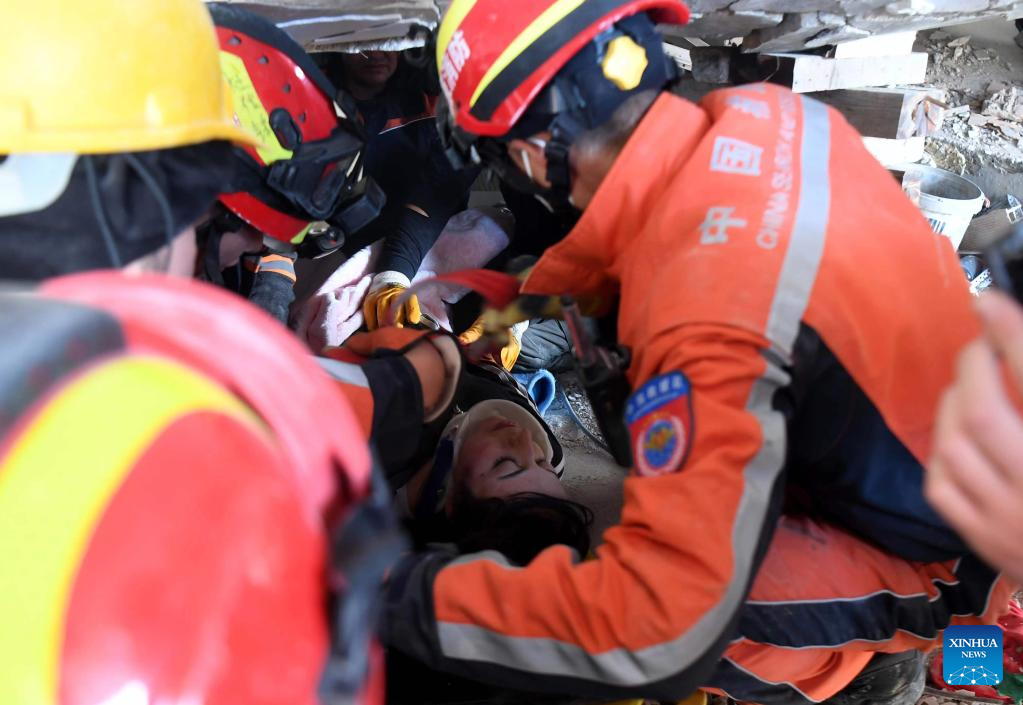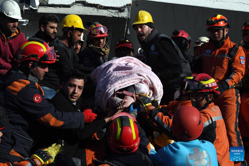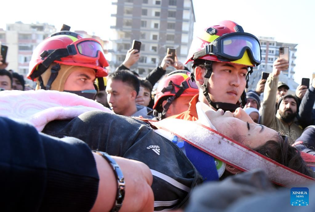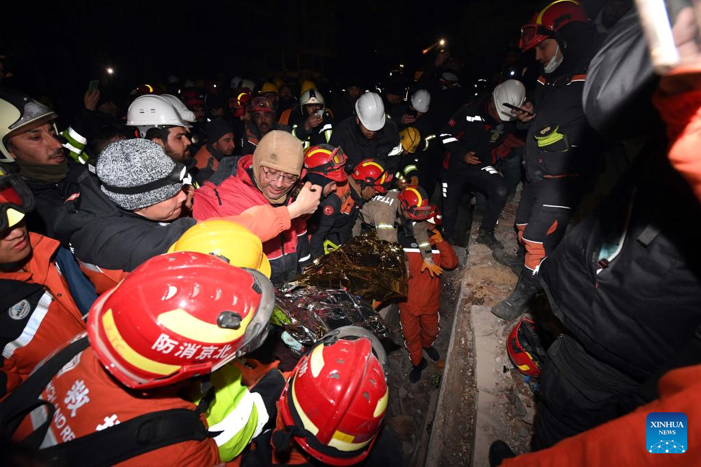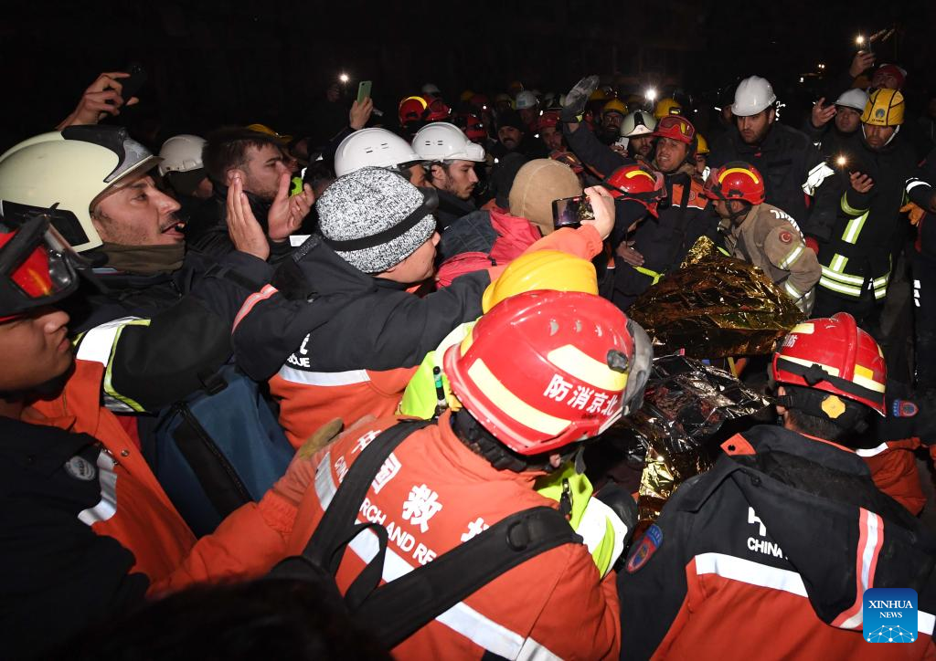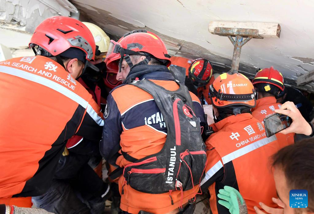 In Antakya, Hatay, Chinese and Turkish rescuers successfully saved three women from the rubble of collapsed buildings on Thursday through their joint operations. (Xinhua/Shadati)