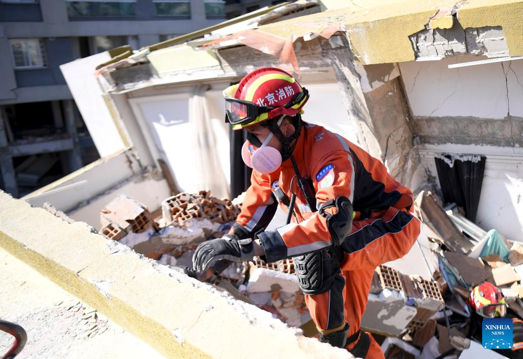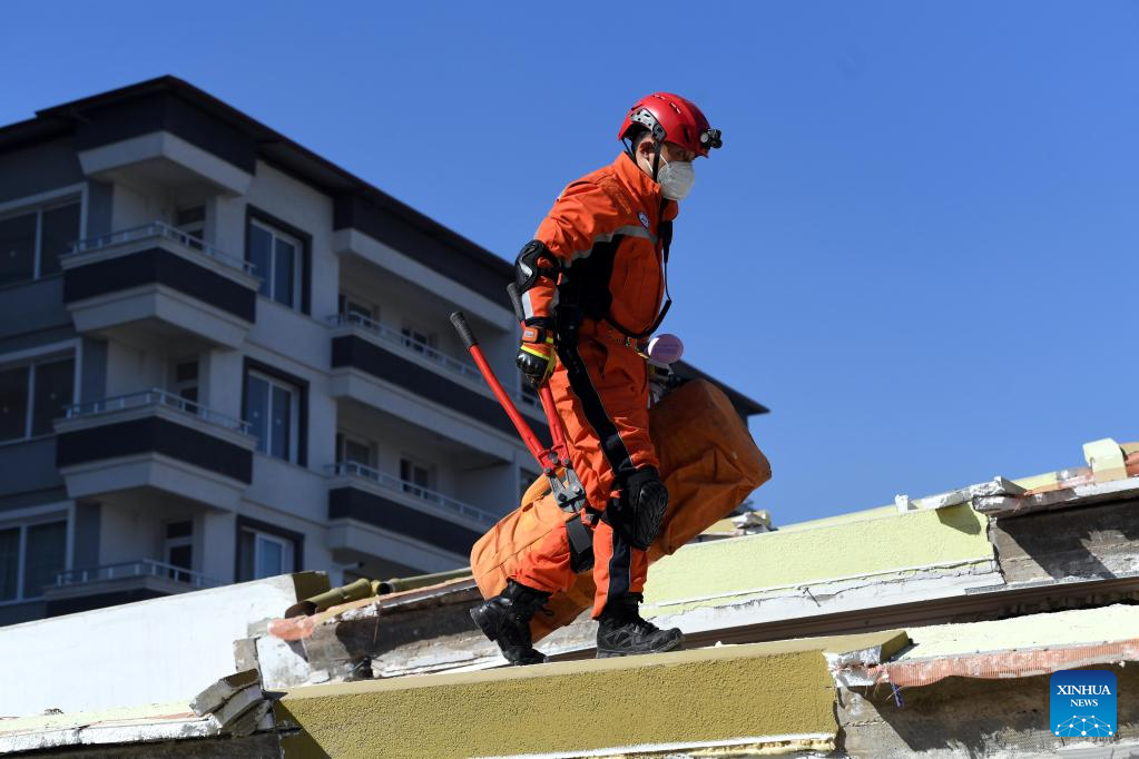 A member of the China Search and Rescue Team carries out rescue operation on earthquake debris in Antakya in the southern province of Hatay, Türkiye, Feb. 9, 2023. An 82-member Chinese rescue team that arrived in Türkiye on Wednesday rushed to the quake-impacted zone to assist in rescue efforts. (Xinhua/Shadati)