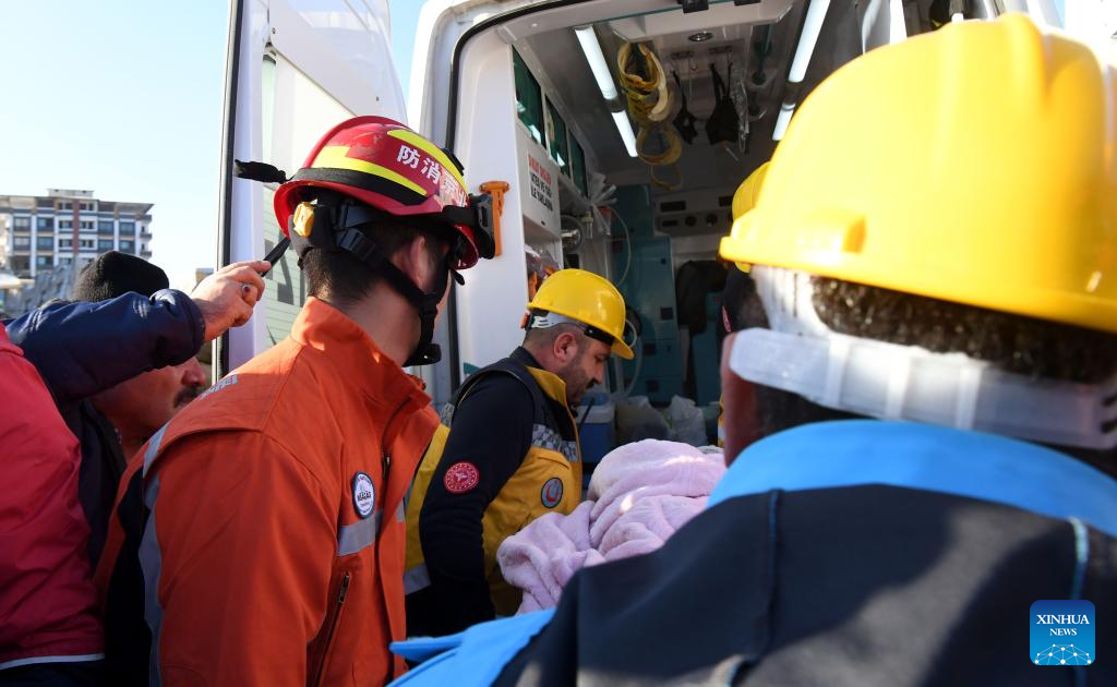 Members of the China Search and Rescue Team transfer a woman survivor with their local partners in Antakya in the southern province of Hatay, Türkiye, Feb. 9, 2023. In Antakya, Hatay, Chinese and Turkish rescuers successfully saved three women from the rubble of collapsed buildings on Thursday through their joint operations. (Xinhua/Shadati)
