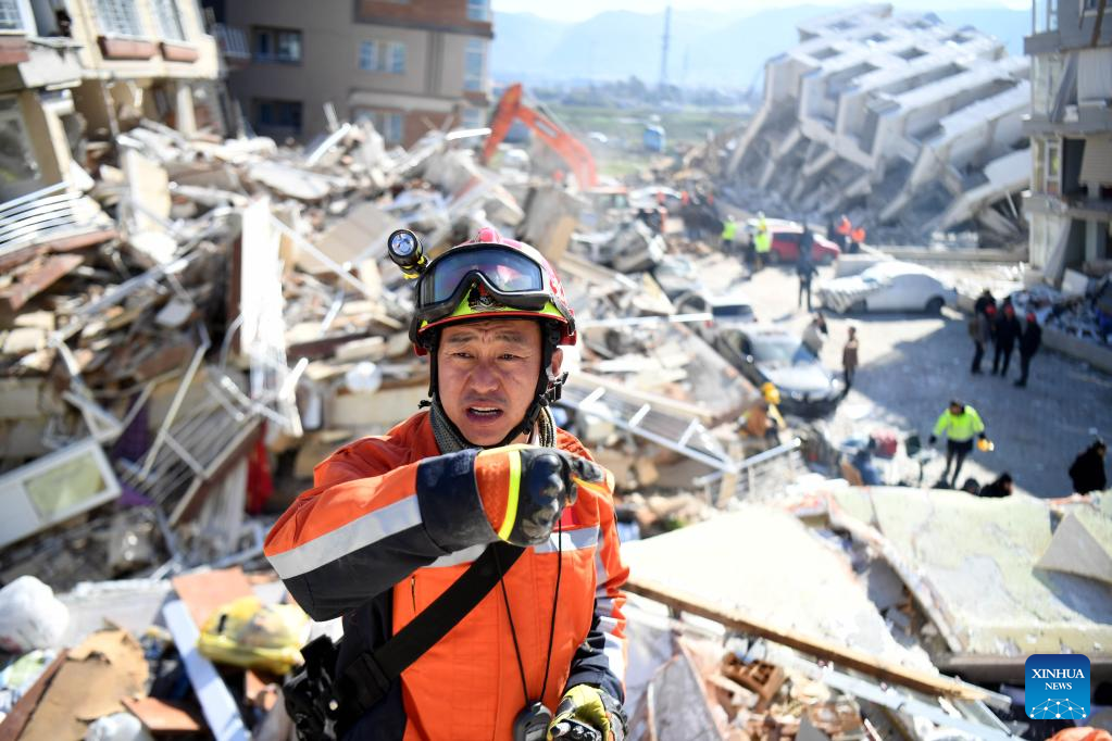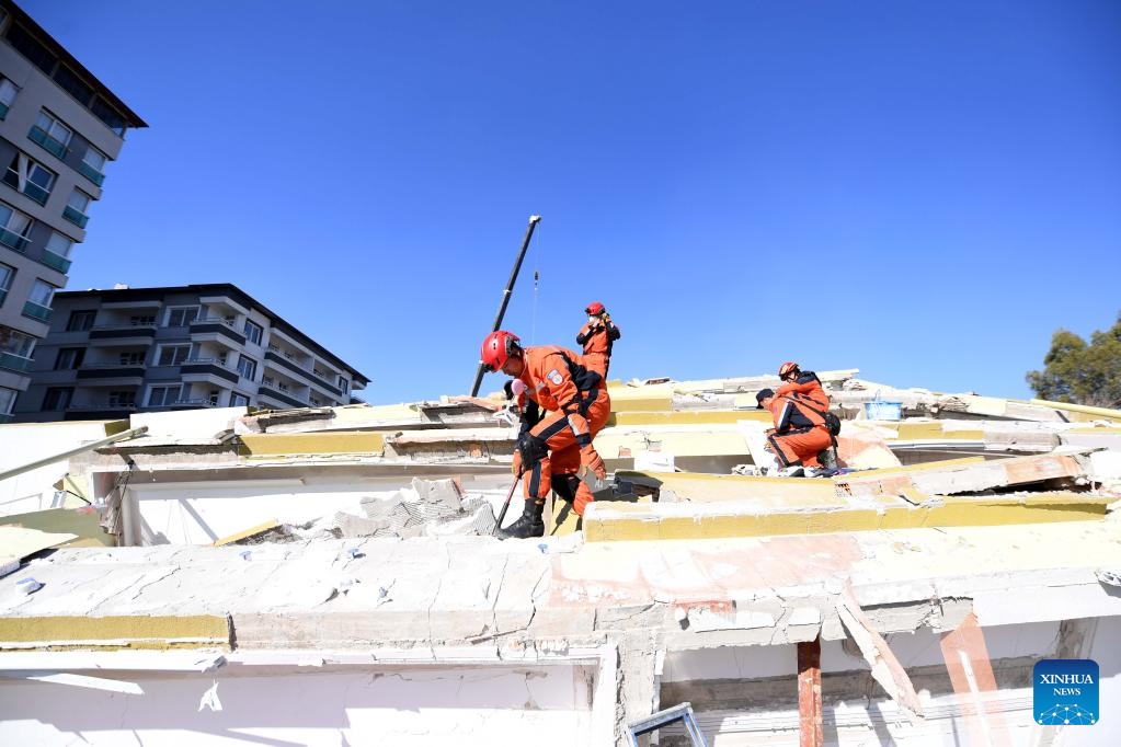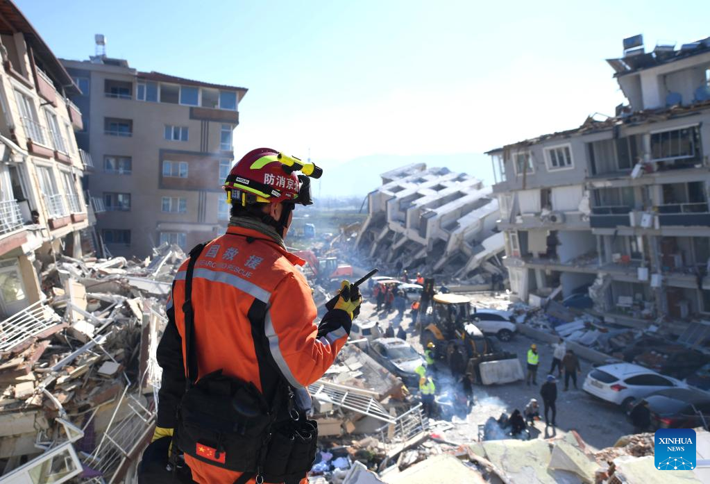 Members of the China Search and Rescue Team carry out rescue operation on earthquake debris in Antakya in the southern province of Hatay, Türkiye, Feb. 9, 2023. An 82-member Chinese rescue team that arrived in Türkiye on Wednesday rushed to the quake-impacted zone to assist in rescue efforts. (Xinhua/Shadati)