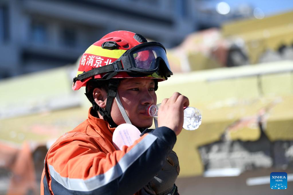A member of the China Search and Rescue Team drinks water during the rescue operation on earthquake debris in Antakya in the southern province of Hatay, Türkiye, Feb. 9, 2023. An 82-member Chinese rescue team that arrived in Türkiye on Wednesday rushed to the quake-impacted zone to assist in rescue efforts. (Xinhua/Shadati)