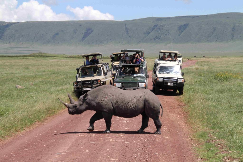 The file photo taken on April 10, 2016 shows a black rhinoceros in Ngorongoro Crater, Tanzania. (Xinhua/Li Sibo)