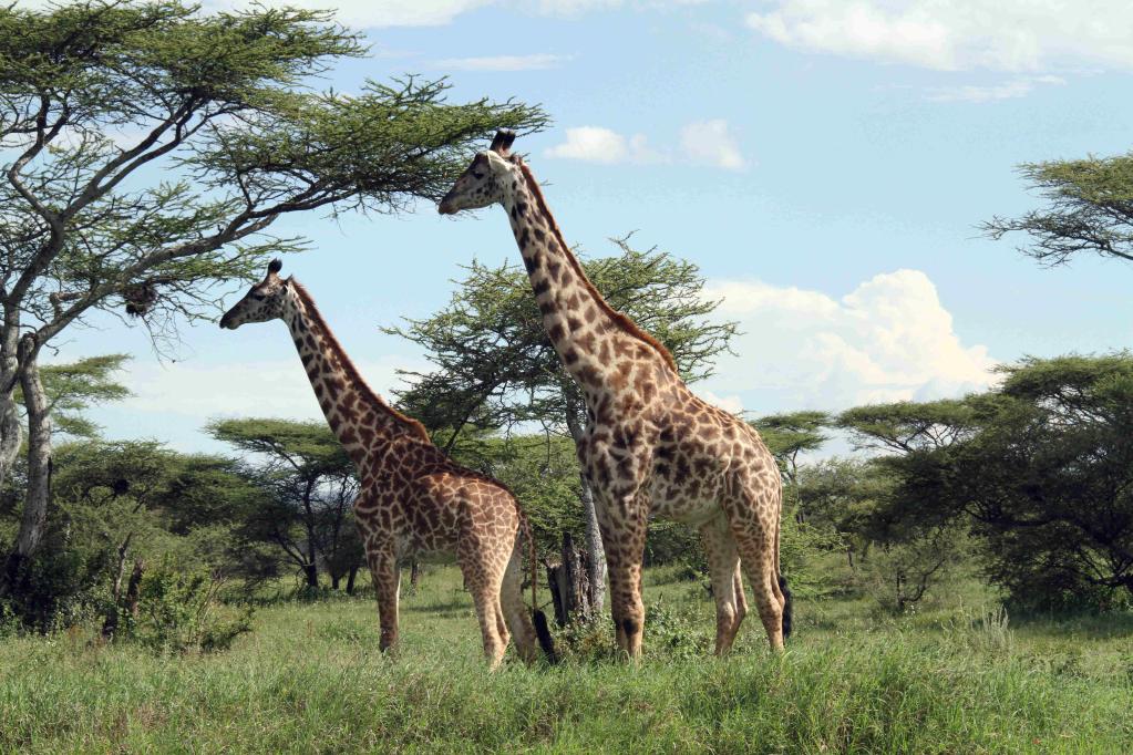 The file photo taken on April 10, 2016 shows two giraffes in Ngorongoro Crater, Tanzania. (Xinhua/Li Sibo)