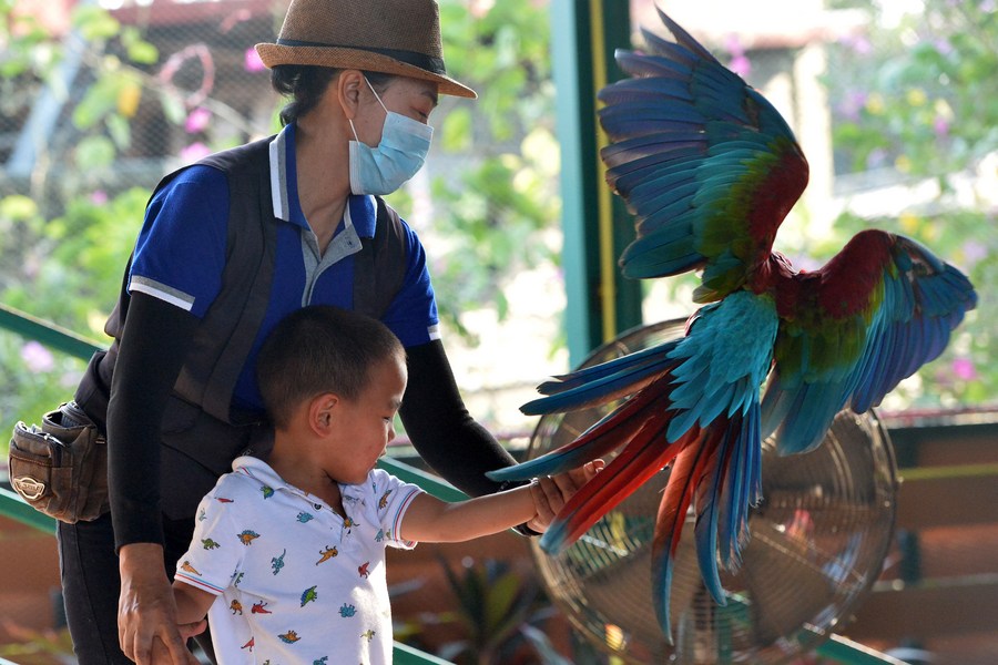 A child interacts with a parrot at the Pattaya Bird Park in Chonburi province, Thailand on Feb. 8, 2023. (Xinhua/Rachen Sageamsak)