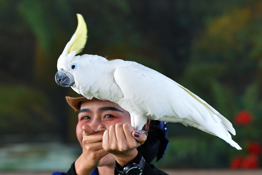 A trainer interacts with a parrot the Pattaya Bird Park in Chonburi province, Thailand on Feb. 8, 2023. (Xinhua/Rachen Sageamsak)