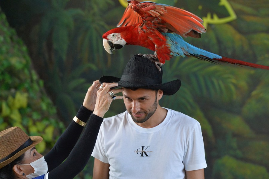 A man interacts with a parrot at the Pattaya Bird Park in Chonburi province, Thailand on Feb. 8, 2023. (Xinhua/Rachen Sageamsak)