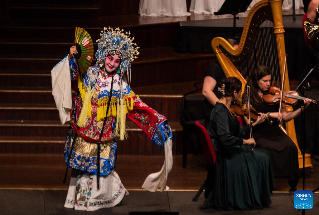 A Peking opera singer performs during a symphonic concert at the Town Hall in Sydney, Australia, on Feb. 10, 2023. An Australian local orchestra presented a symphonic concert containing Chinese classical music on Friday night at Sydney's major landmark Town Hall.
