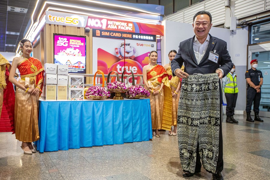 Yuthasak Supasorn, governor of the Tourism Authority of Thailand (TAT), shows a gift for Chinese tourists at Don Mueang International Airport in Bangkok, Thailand, Feb. 6, 2023. (Xinhua/Wang Teng)