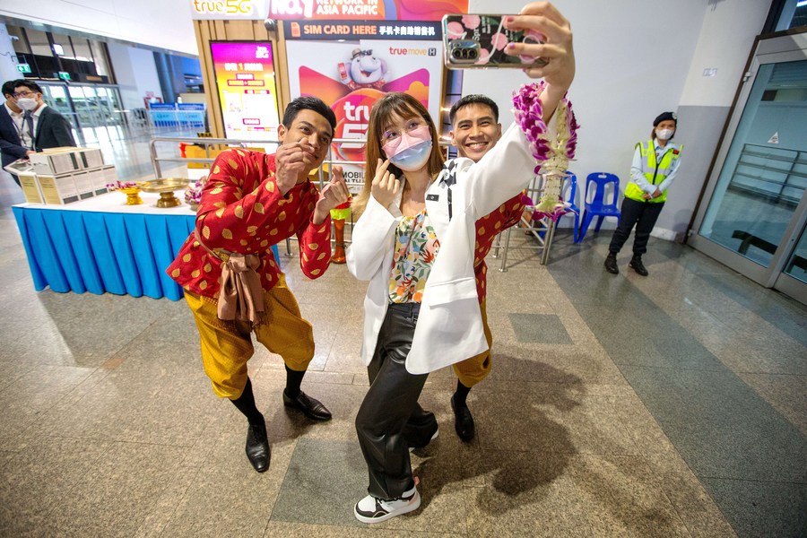 A Chinese tourist takes a selfie with Thai staff members at Don Mueang International Airport in Bangkok, Thailand, Feb. 6, 2023. (Xinhua/Wang Teng)