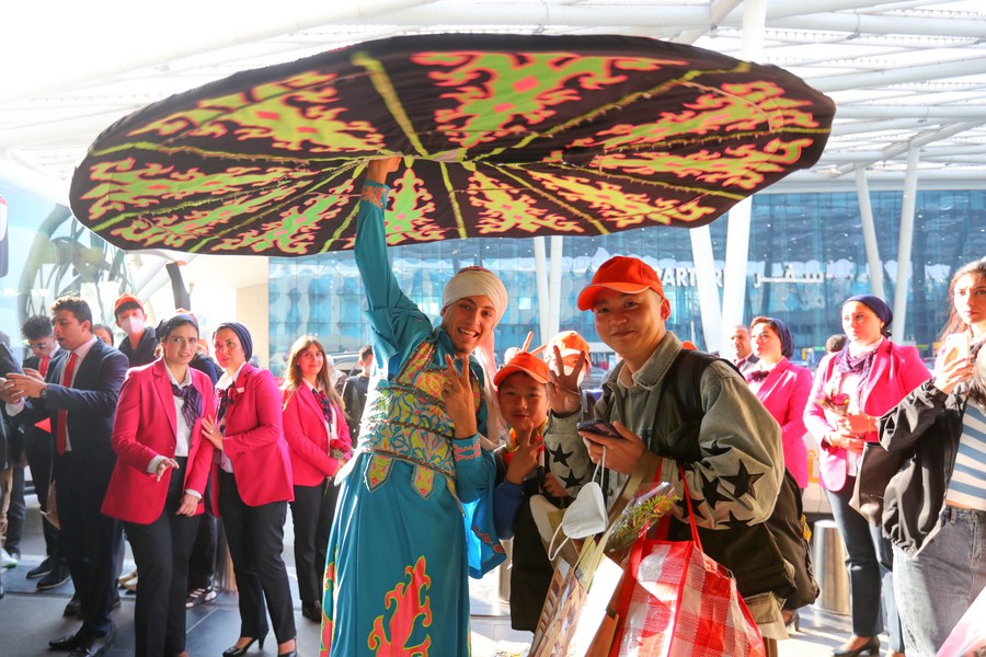 An Egyptian artist performs a traditional folk dance to welcome Chinese tourists at the Cairo International Airport in Cairo, Egypt, Jan. 20, 2023. (Xinhua/Sui Xiankai)