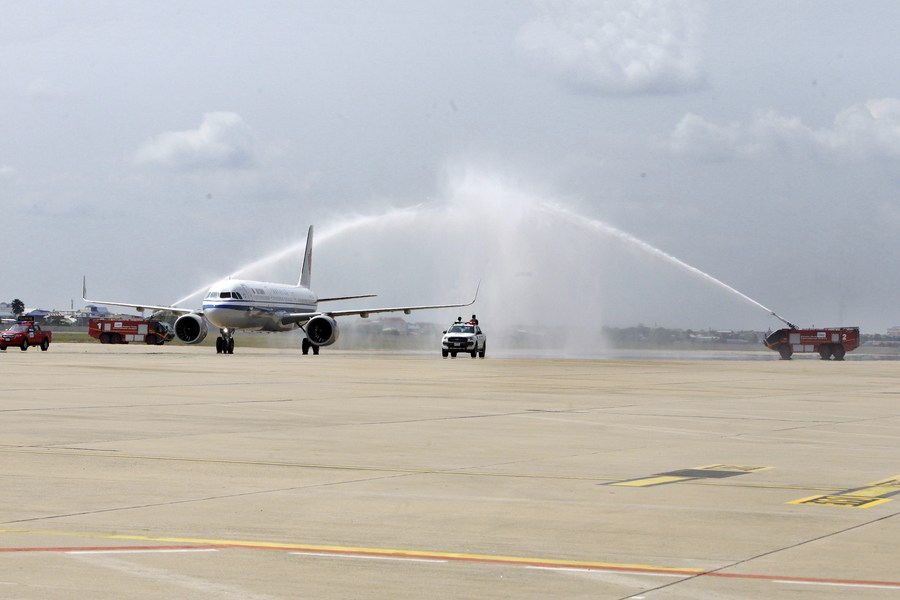 Air China flight CA745, carrying some 125 Chinese tourists, arrives at the Phnom Penh International Airport in Phnom Penh, Cambodia, Feb. 7, 2023. (Photo by Phearum/Xinhua)