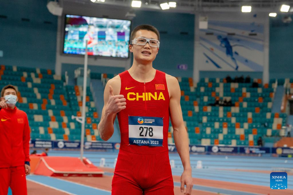 Fang Yaoqing of China competes during the men's triple jump final at the 10th Asian Indoor Athletics Championships in Astana, Kazakhstan on Feb. 10, 2023. (Athletics Federation of Kazakhstan/Handout via Xinhua)
