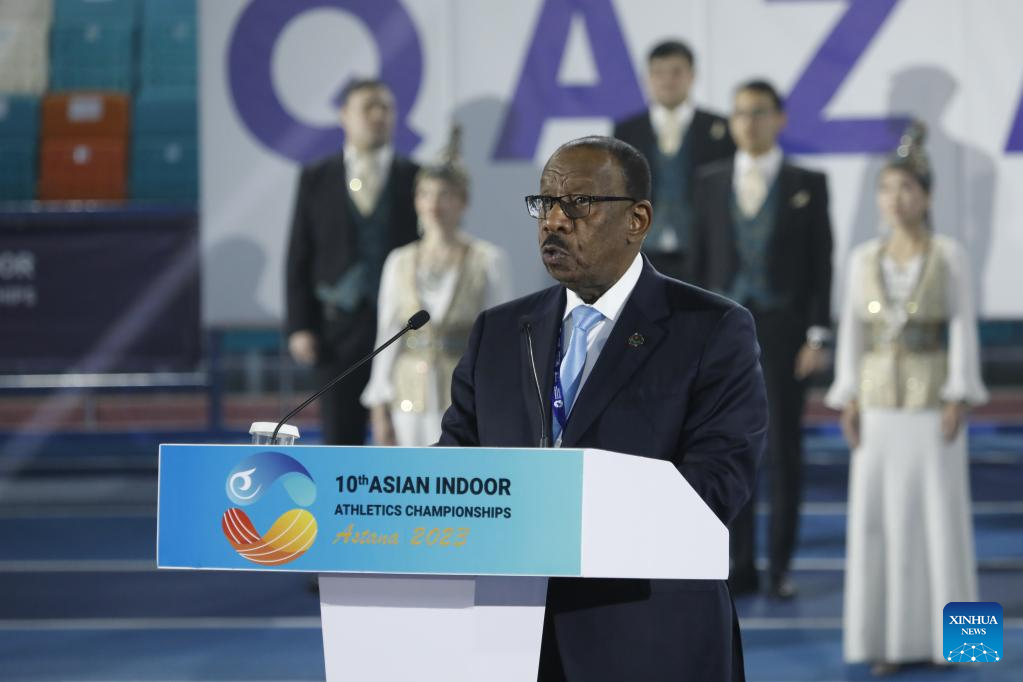 Asian Athletic Association President Dahlan Jumaan Al-Hamad speaks at the opening ceremony of the 10th Asian Indoor Athletics Championships in Astana, Kazakhstan on Feb. 10, 2023. (Photo by Kalizhan Ospanov/Xinhua)