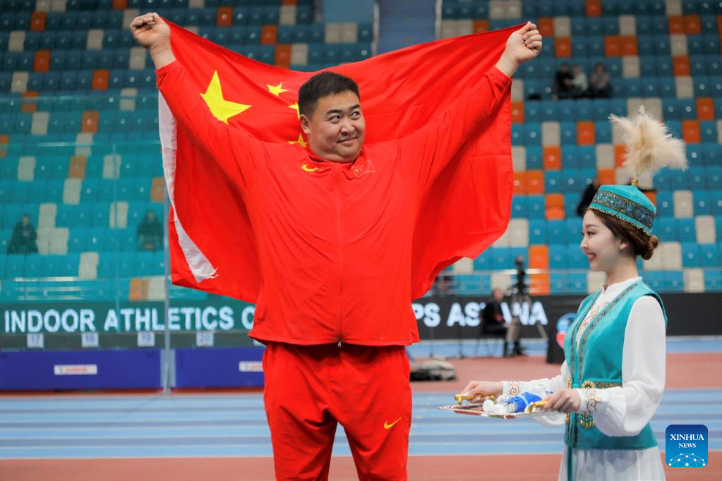 Chen Xiaodong of China celebrates during the awarding ceremony of the men's shot put at the 10th Asian Indoor Athletics Championships in Astana, Kazakhstan on Feb. 10, 2023. (Photo by Kalizhan Ospanov/Xinhua)