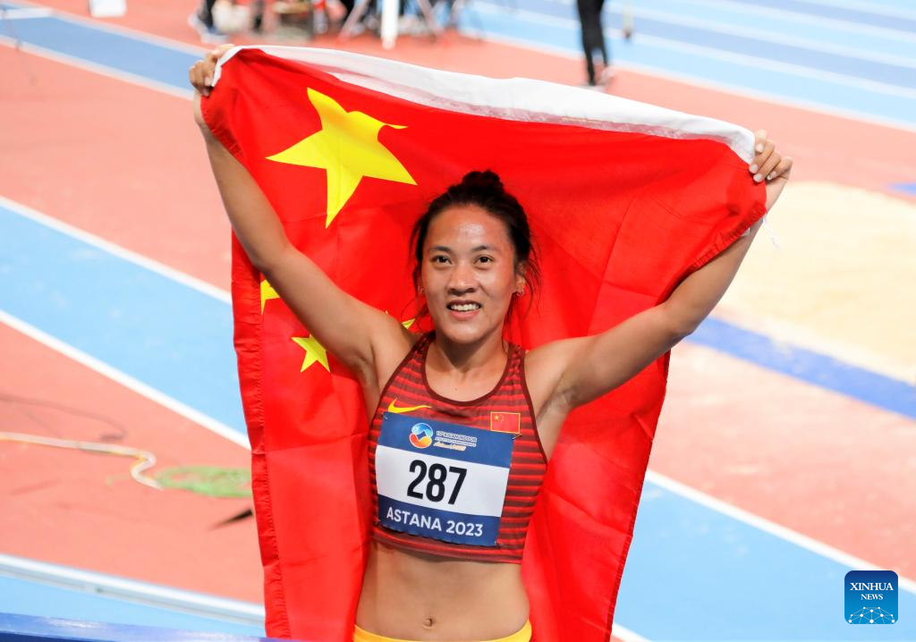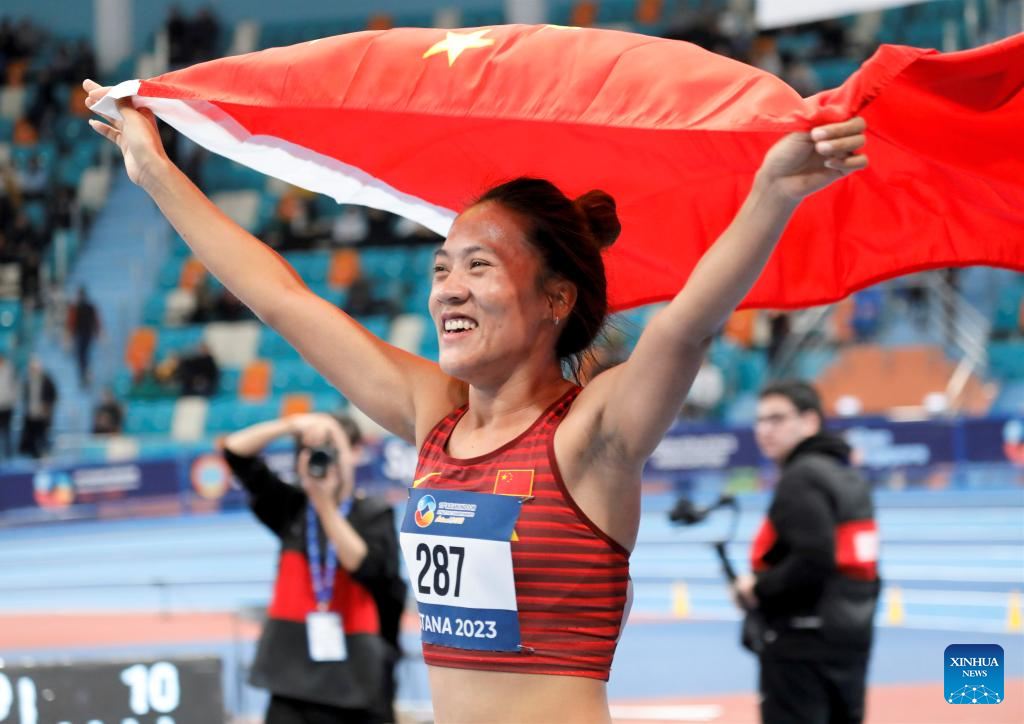 He Wuga of China celebrates after the women's 3000m final at the 10th Asian Indoor Athletics Championships in Astana, Kazakhstan on Feb. 10, 2023. (Photo by Kalizhan Ospanov/Xinhua)