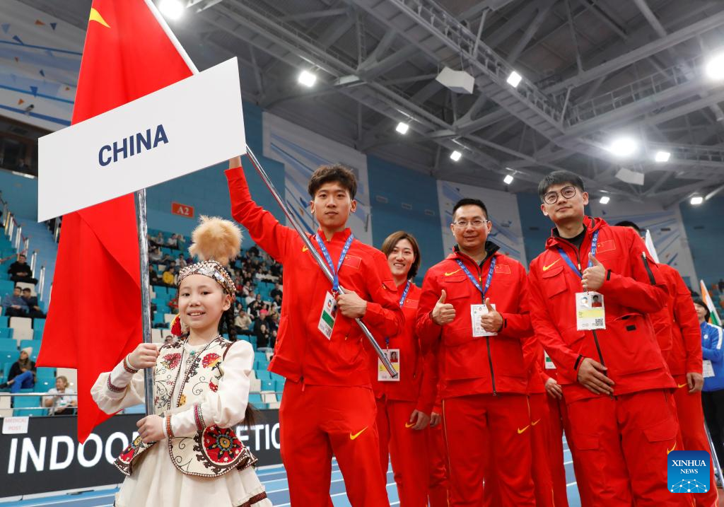 The delegation of China attends the opening ceremony of the 10th Asian Indoor Athletics Championships in Astana, Kazakhstan. (Photo by Kalizhan Ospanov/Xinhua)