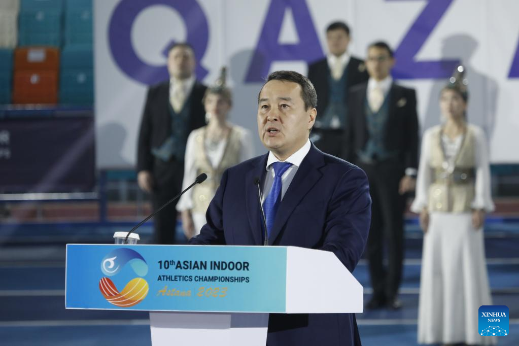Kazakh Prime Minister Alikhan Smailov speaks at the opening ceremony of the 10th Asian Indoor Athletics Championships in Astana, Kazakhstan on Feb. 10, 2023. (Photo by Kalizhan Ospanov/Xinhua)