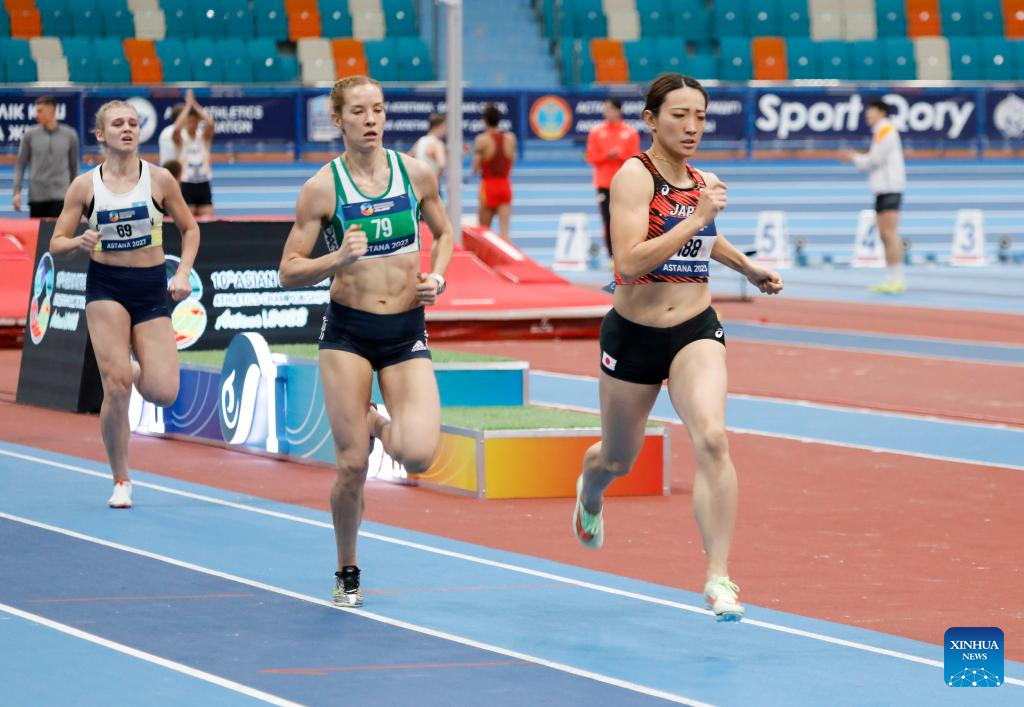 Yamasaki Yuki (2nd R) of Japan competes in the 800m of the women's pentathlon at the 10th Asian Indoor Athletics Championships in Astana, Kazakhstan on Feb. 10, 2023. (Photo by Kalizhan Ospanov/Xinhua)