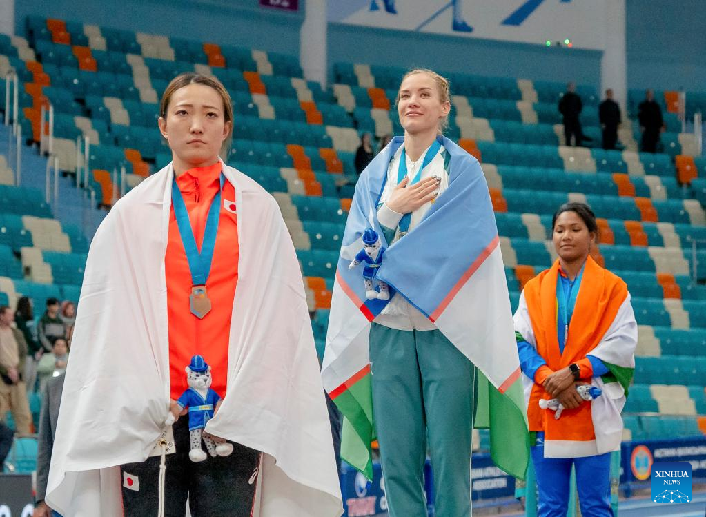 (L to R)Bronze medalist Yamasaki Yuki of Japan, gold medalist Ekaterina Voronina of Uzbekistan and silver medalist Swapna Barman of India attend the awarding ceremony of the women's pentathlon at the 10th Asian Indoor Athletics Championships in Astana, Kazakhstan on Feb. 10, 2023. (Athletics Federation of Kazakhstan/Handout via Xinhua)