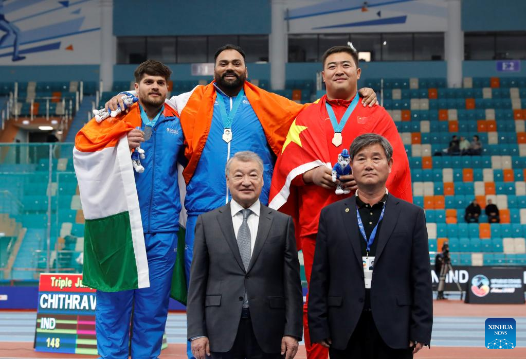 (Top row L to R)Silver medalist Karanveer Singh of India, gold medalist Tajinderpal Singh Toor of India and bronze medalist Chen Xiaodong of China pose with guests during the awarding ceremony of men's shot put at the 10th Asian Indoor Athletics Championships in Astana, Kazakhstan on Feb. 10, 2023. (Photo by Kalizhan Ospanov/Xinhua)