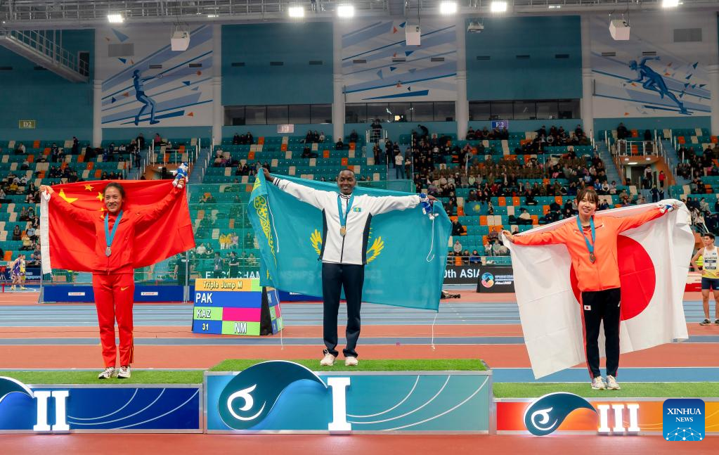 (L to R) Silver medalist He Wuga of China, gold medalist Caroline Chepkoech Kipkirui of Kazakhstan and bronze medalist Yamamoto Yuma of Japan attend the awarding ceremony of women's 3000m at the 10th Asian Indoor Athletics Championships in Astana, Kazakhstan on Feb. 10, 2023. (Athletics Federation of Kazakhstan/Handout via Xinhua)