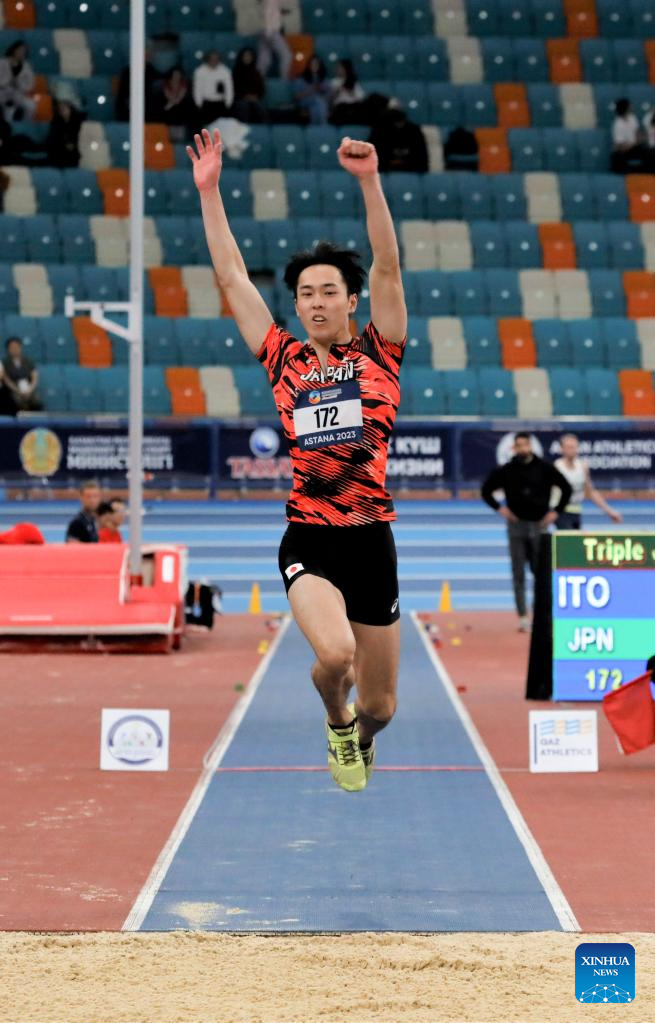 Ito Ruki of Japan competes during the men's triple jump final at the 10th Asian Indoor Athletics Championships in Astana, Kazakhstan on Feb. 10, 2023. (Photo by Kalizhan Ospanov/Xinhua)
