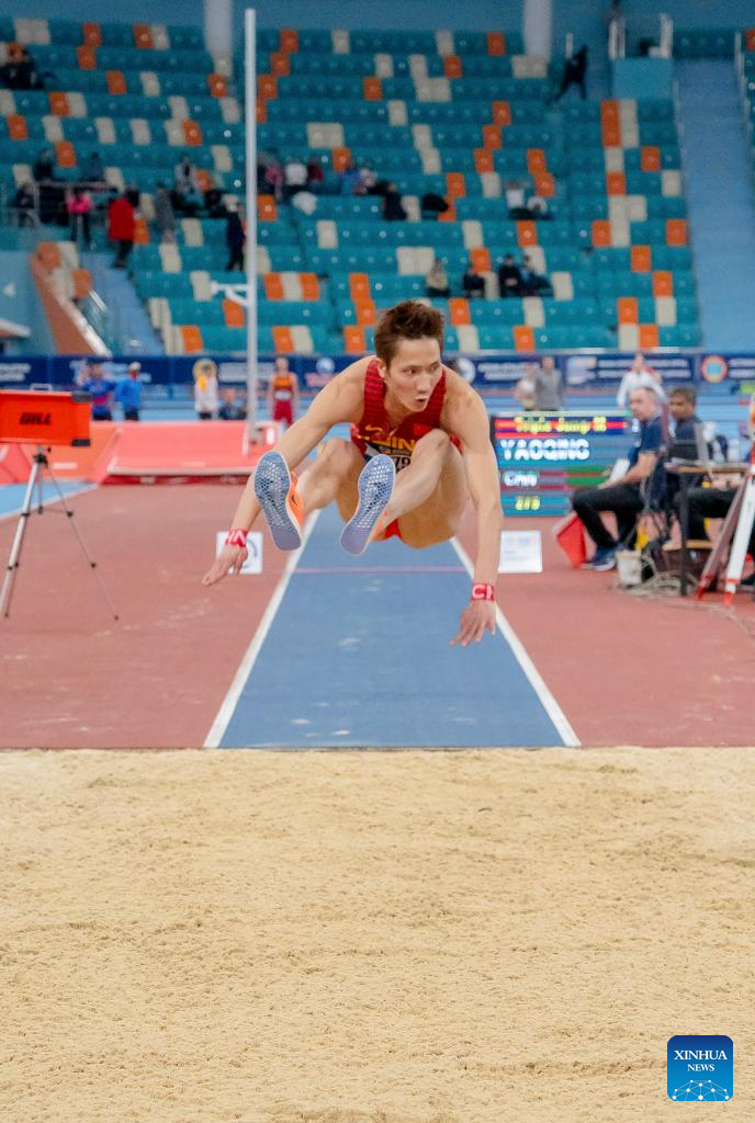 Su Wen of China competes during the men's triple jump final at the 10th Asian Indoor Athletics Championships in Astana, Kazakhstan on Feb. 10, 2023. (Athletics Federation of Kazakhstan/Handout via Xinhua)