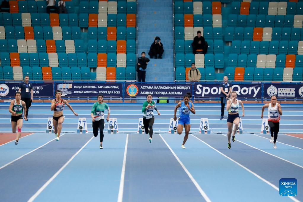 Kimishima Arisa (2nd L) of Japan sprints during the women's 60m final at the 10th Asian Indoor Athletics Championships in Astana, Kazakhstan on Feb. 10, 2023. (Photo by Kalizhan Ospanov/Xinhua)
