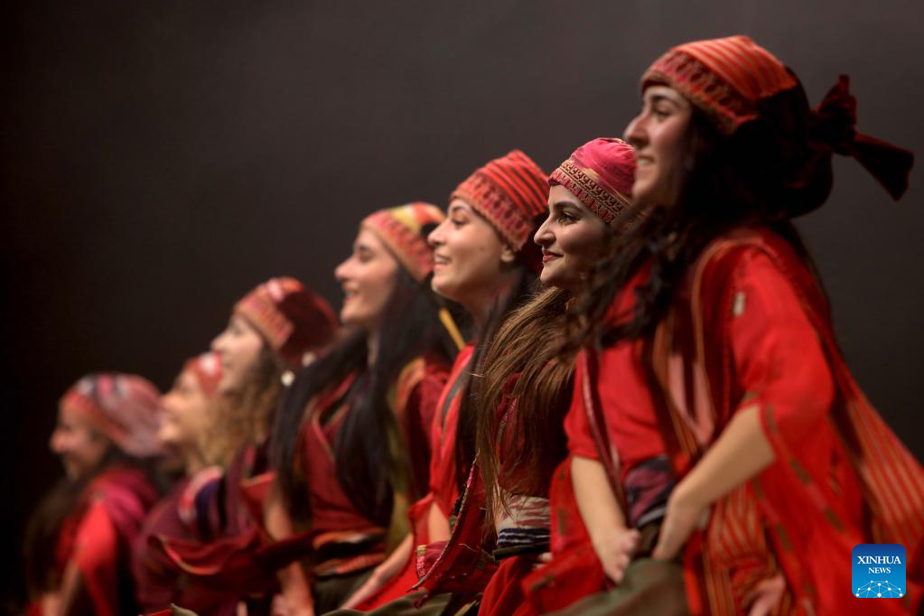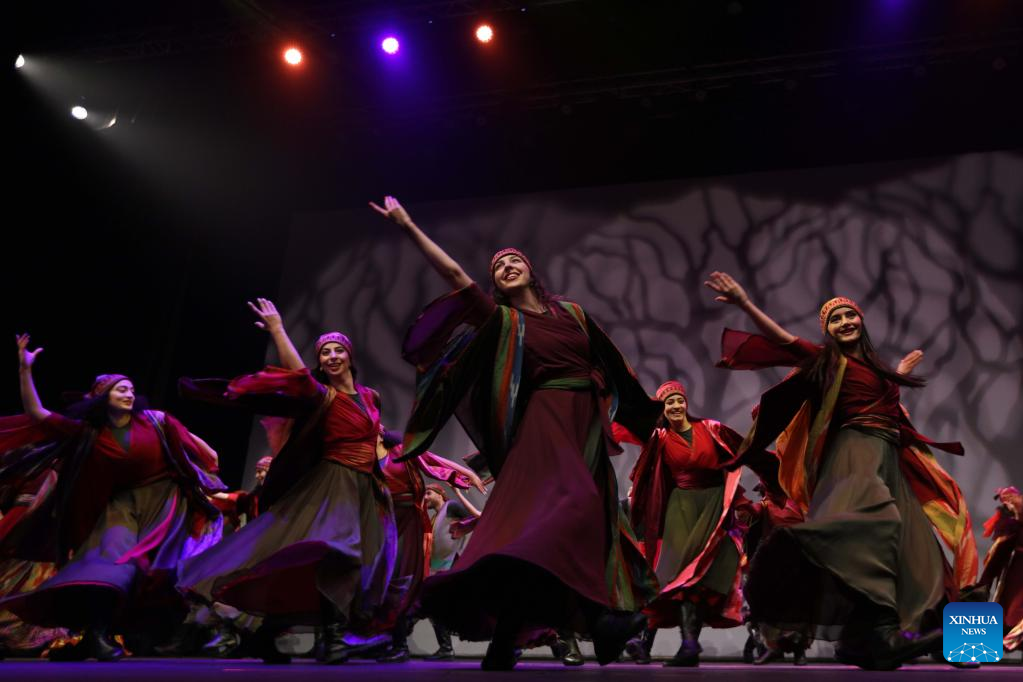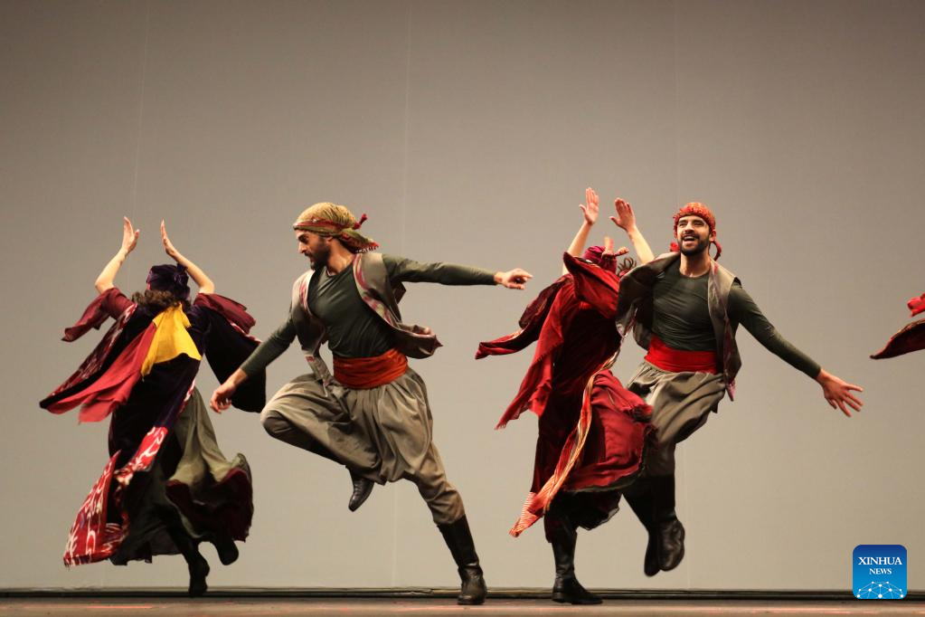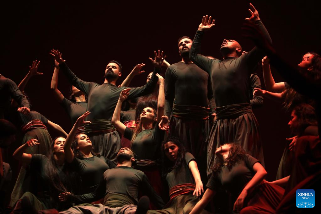 Artists perform a musical dance narrating a Canaanite tale at the Cultural Palace in Amman, Jordan, on Feb. 10, 2023. (Photo by Mohammad Abu Ghosh/Xinhua)