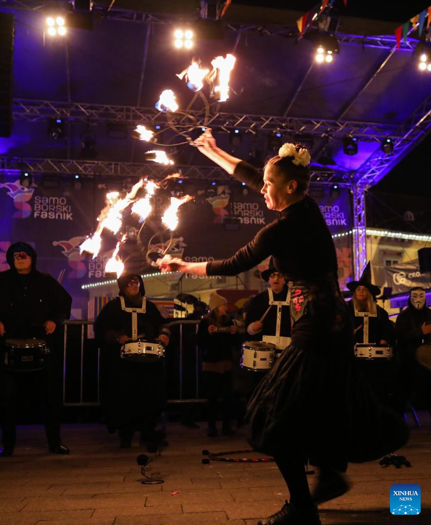 An artist performs during an opening ceremony of the Samobor Carnival in Samobor, Croatia, on Feb. 10, 2023. The Samobor Carnival is one of the oldest carnivals in Croatia. (Emica Elvedji/PIXSELL via Xinhua)