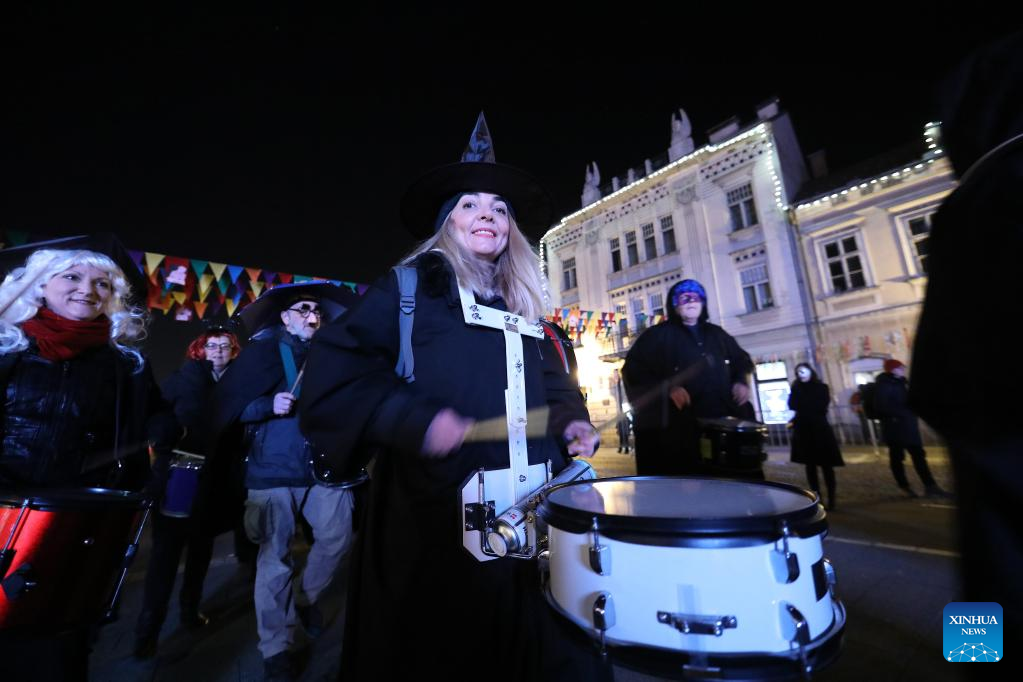 People take part in an opening ceremony of the Samobor Carnival in Samobor, Croatia, on Feb. 10, 2023. The Samobor Carnival is one of the oldest carnivals in Croatia. (Emica Elvedji/PIXSELL via Xinhua)