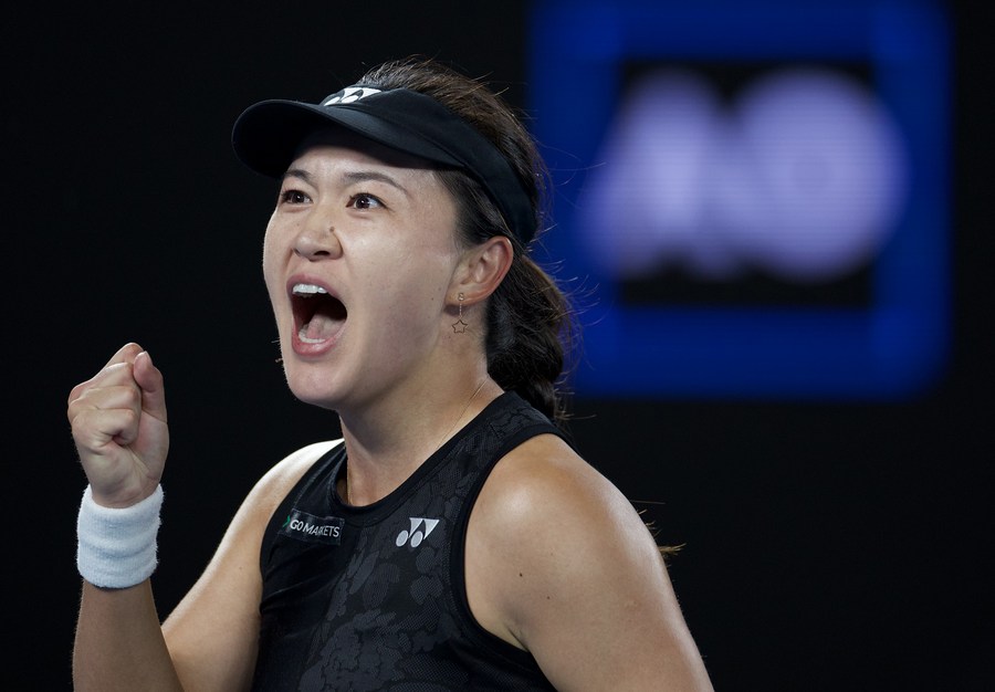 Zhu Lin of China celebrates during the women's singles fourth round match against Victoria Azarenka of Belarus at Australian Open in Melbourne Park in Melbourne, Australia on Jan. 22, 2023. (Photo by Hu Jingchen/Xinhua)