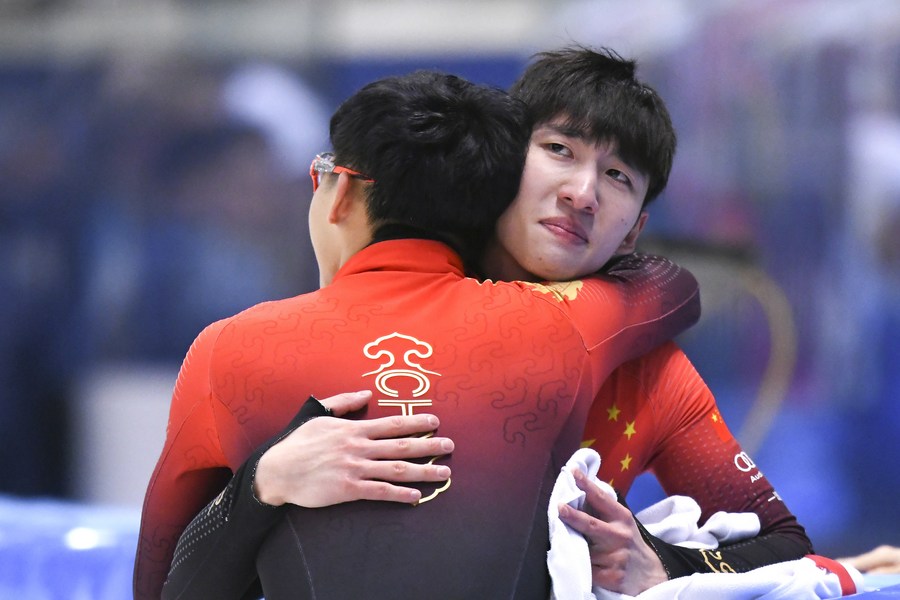 Lin Xiaojun (R) of China hugs his teammate Zhong Yuchen after the men's 500m final A at the ISU World Cup Short Track Speed Skating series in Dresden, Germany on Feb. 5, 2023. (Xinhua/Ren Pengfei)