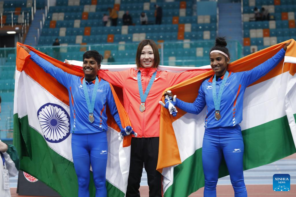 Silver medalist Pavithra Vengatesh of India, gold medalist Nasu Mayu of Japan and bronze medalist Rosy Meena Paulraj of India (L to R) attend the awarding ceremony after the women's pole vault final at the 10th Asian Indoor Athletics Championships in Astana, Kazakhstan, Feb. 11, 2023. (Photo by Kalizhan Ospanov/Xinhua)