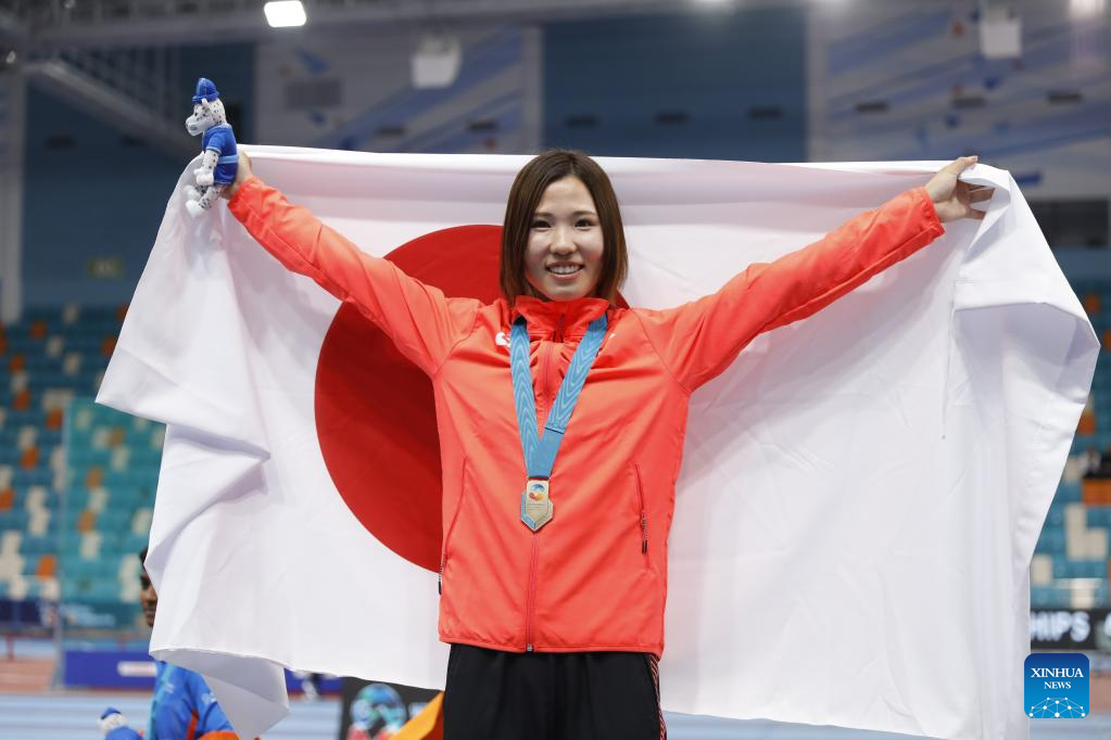 Nasu Mayu of Japan celebrates during the awarding ceremony after the women's pole vault final at the 10th Asian Indoor Athletics Championships in Astana, Kazakhstan, Feb. 11, 2023. (Photo by Kalizhan Ospanov/Xinhua)
